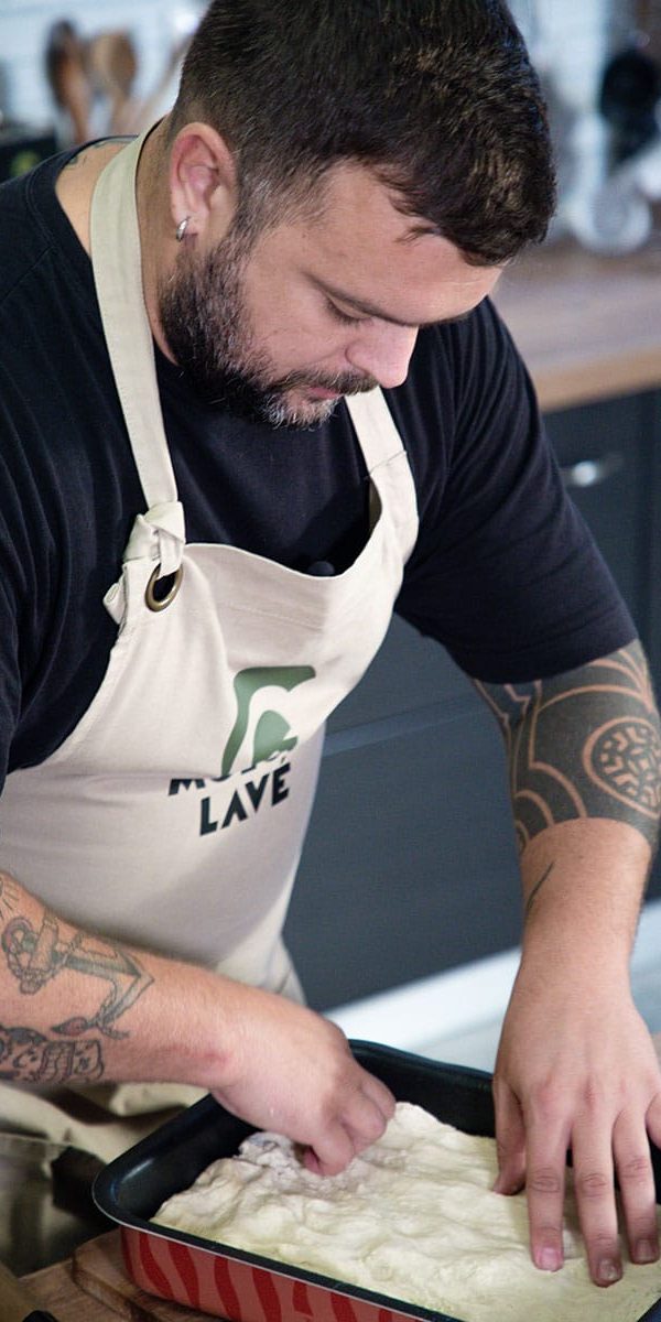 - Μόλις αρχίσει να ζυμώνεται προσθέτουμε το αλάτι, την αφήνουμε να ζυμωθεί καλά στον γάντζο και προσθέτουμε 30-50ml Βιολογικό ελαιόλαδο MOLON LAVE μέχρι να γυαλίσει.